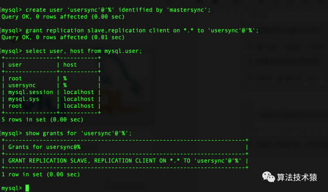 $ grant replication slave,replication client on *.* to 'usersync'@'%';
