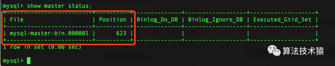 记录下日志文件名称:mysql-master-bin.000001,postion:623;后续需要在slave中进行配置