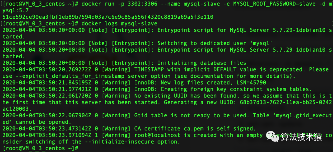 $ docker run -p 3302:3306 --name mysql-slave -e MYSQL_ROOT_PASSWORD=slave -d mysql:5.7