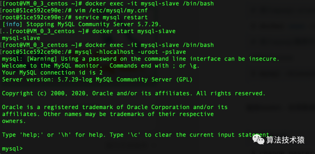 # 进入mysql服务中,在-p后面输入密码,上面指定的密码-e MYSQL_ROOT_PASSWORD=slave