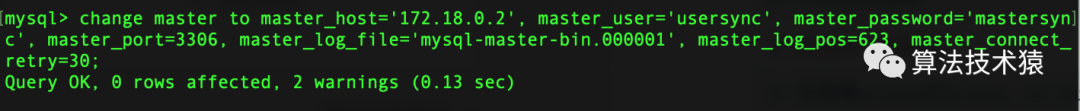 $ change master to master_host='172.18.0.2', master_user='usersync', master_password='mastersync', master_port=3306, master_log_file='mysql-master-bin.000001', master_log_pos=623, master_connect_retry=30;
