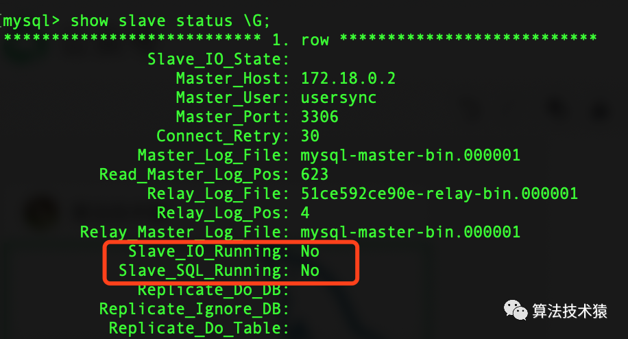 # 查看salve状态, 此时状态:Slave_IO_Running: No, Slave_SQL_Running: No