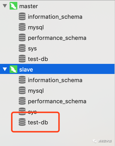 刷新从库slave后,发现在slave库中也存在test-db库,即表示主从部署成功