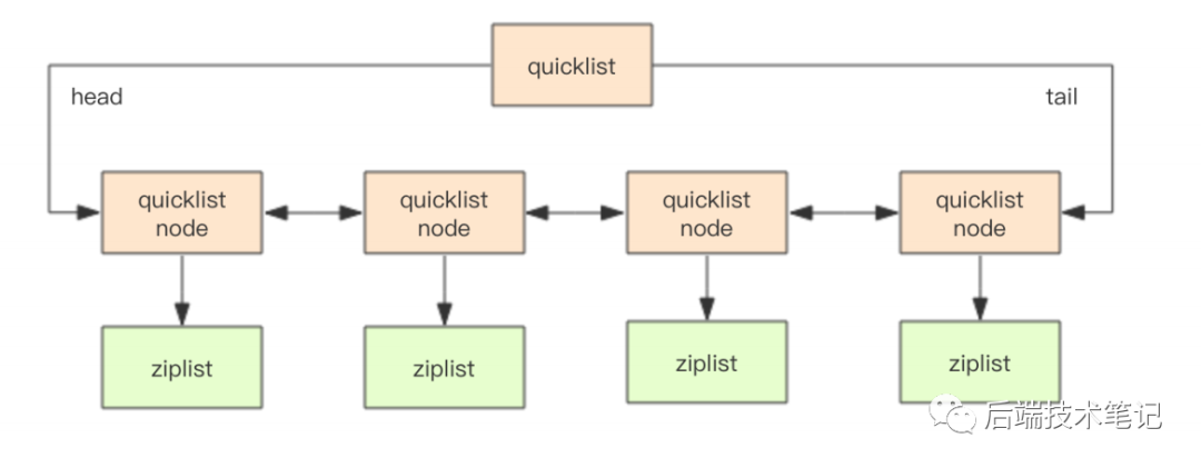 5、list链表结构:quicklist是ziplist和linkedlist的混合体,它将linkedlist按段切分,每一段使用ziplist来紧凑存储,多个ziplist之间使用双向指针串接起来。