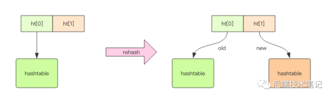 2、dict 是 Redis 服务器中出现最为频繁的复合型数据结构,除了 hash 结构的数据会用到字典外,整个 Redis 数据库的所有 key 和 value 也组成了一个全局字典,还有带过期时间 的 key 集合也是一个字典,zset 集合中存储 value 和 score 值的映射关系也是通过 dict 结构实现的。dict结构内部包含了两个hashtable,通常情况下只有一个hashtable有值,但是在dict扩容和缩容时,需要分配新的hashtable,然后进行渐进式搬迁,这时候两个hashtable存储的分别是旧的hashtable和新的hashtable,搬迁结束后,旧的hashtable被删除,新的hashtable取而代之。hashtable的结构和java的HashMap几乎是一样的
