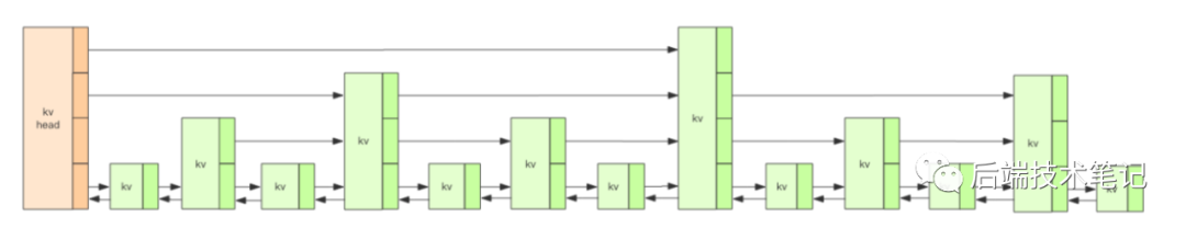 redis的跳跃表一共有64层,最多可以容纳2的64次方个元素,同一层的kv块使用指针串起来形成一个双向链表,是有序排列的,每一个层元素的遍历都是从 kv header 出发,每一个kv块的数据结构如下所示: