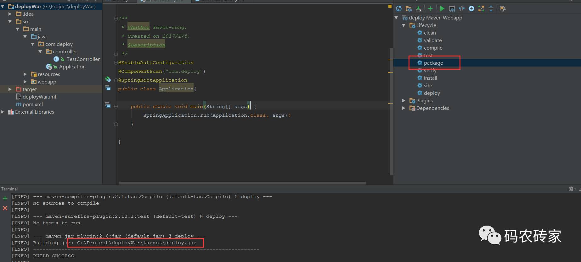 执行命令 mvn package或者在IDEA的maven插件中双击“package”,如下图所示: