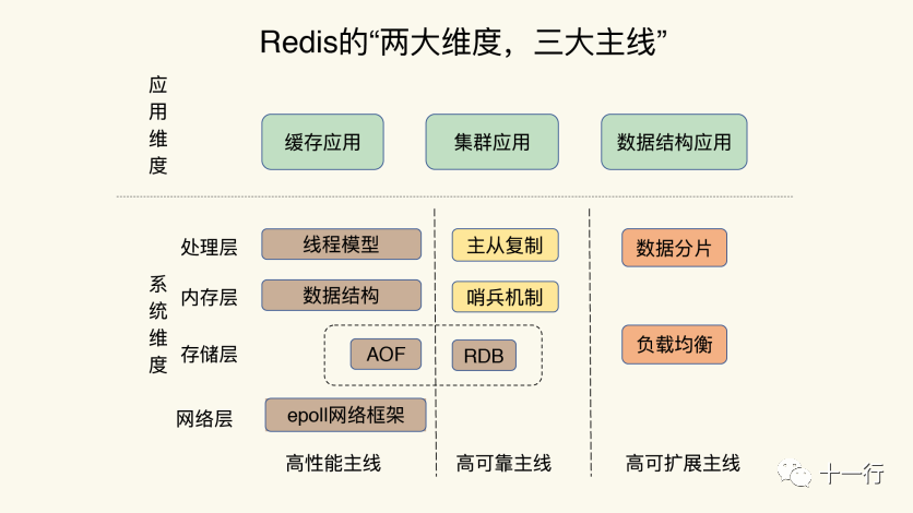 高性能主线,包括线程模型、数据结构、持久化、网络框架;高可靠主线,包括主从复制、哨兵机制;高可扩展主线,包括数据分片、负载均衡。