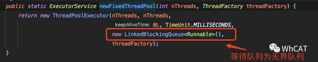 2)无界队列:队列的容量无上限,即使用无界队列的线程池实际运行的线程数总是小于等于核心线程数。调用LinkedBlockingQueue无参构造器构造出来的队列为无界队列。