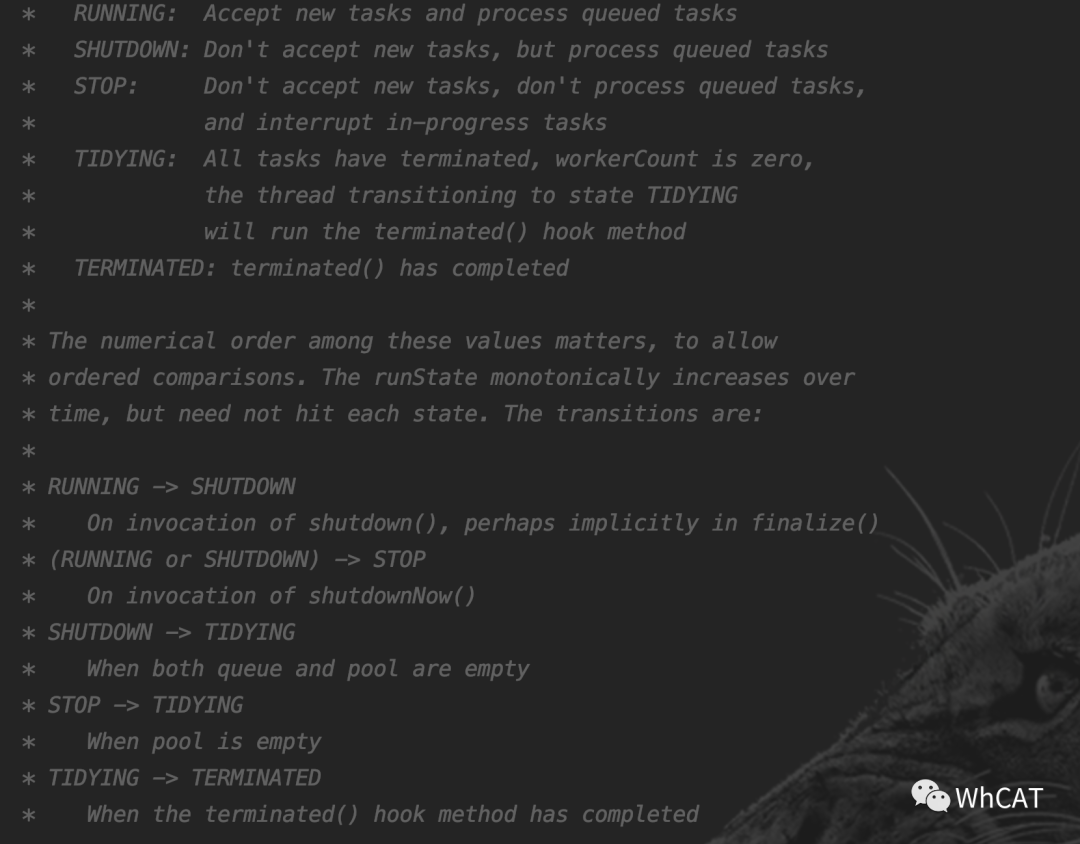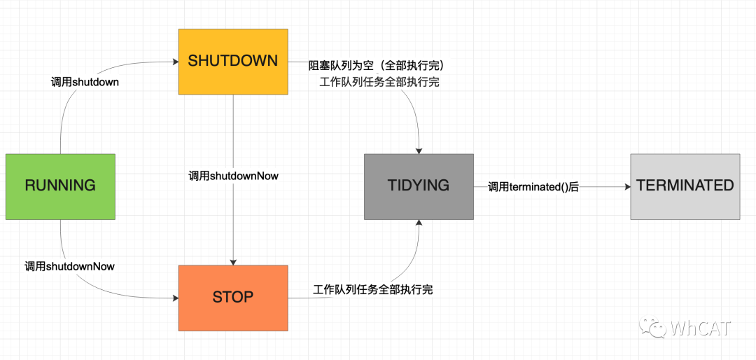 变为SHUTDOWN状态,通过调用函数shutdown()实现;变为STOP状态,通过调用shutdownNow()实现;由SHUTDOWN状态变为TIDYING状态,是在工作队列以及阻塞队列的任务全部处理完后;由STOP状态变为TIDYING状态,是在工作队列任务全部处理完后;由TIDYING变为TERMINATED是在执行完函数terminated()后。