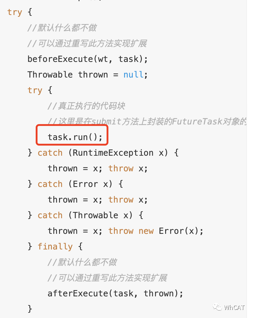 final void runWorker(Worker w) {Thread wt = Thread.currentThread();Runnable task = w.firstTask;w.firstTask = null;w.unlock(); // allow interruptsboolean completedAbruptly = true;try {//while循环,当firstTask执行完成后或本来就为空时//会通过getTask方法从阻塞队列中获取新的任务执行//如果getTask()结果为null,则跳出循环,结束线程运行while (task != null || (task = getTask()) != null) {w.lock();// If pool is stopping, ensure thread is interrupted;// if not, ensure thread is not interrupted. This// requires a recheck in second case to deal with// shutdownNow race while clearing interruptif ((runStateAtLeast(ctl.get(), STOP) ||(Thread.interrupted() &&runStateAtLeast(ctl.get(), STOP))) &&!wt.isInterrupted())wt.interrupt();try {//默认什么都不做//可以通过重写此方法实现扩展beforeExecute(wt, task);Throwable thrown = null;try {//真正执行的代码块//这里是在submit方法上封装的FutureTask对象的run方法task.run();} catch (RuntimeException x) {thrown = x; throw x;} catch (Error x) {thrown = x; throw x;} catch (Throwable x) {thrown = x; throw new Error(x);} finally {//默认什么都不做//可以通过重写此方法实现扩展afterExecute(task, thrown);}} finally {task = null;w.completedTasks++;w.unlock();}}completedAbruptly = false;} finally {processWorkerExit(w, completedAbruptly);}}