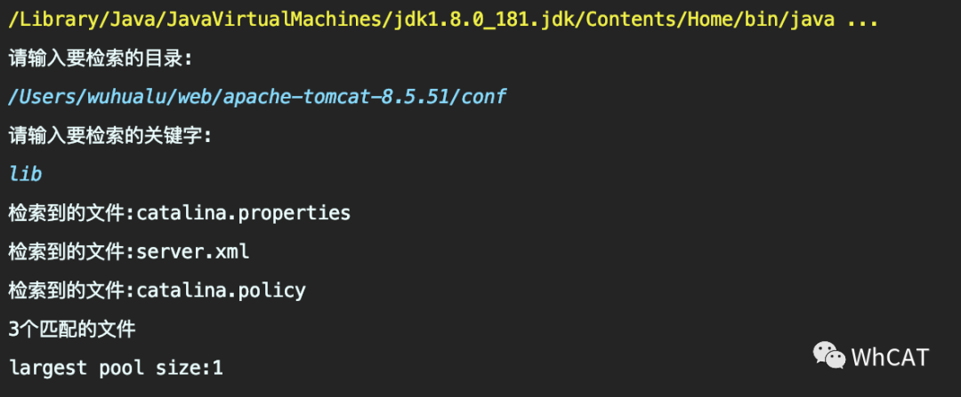 public class Application {private static final ExecutorService pool = new ThreadPoolExecutor(10, 20, 60, TimeUnit.SECONDS, new ArrayBlockingQueue<>(100));public static void main(String[] args) {try (Scanner in = new Scanner(System.in)) {System.out.println("请输入要检索的目录:");String directory = in.nextLine();System.out.println("请输入要检索的关键字:");String keyword = in.nextLine();MatchCounter counter = new MatchCounter(new File(directory), keyword);Future<Integer> future = pool.submit(counter);System.out.println(future.get() + "个匹配的文件");System.out.println("largest pool size:" + ((ThreadPoolExecutor)pool).getLargestPoolSize());pool.shutdown();} catch (Exception e) {e.printStackTrace();}}/*** 搜索关键字出现的文件数*/static class MatchCounter implements Callable<Integer> {private final File directory;private final String keyword;public MatchCounter(File directory, String keyword) {this.directory = directory;this.keyword = keyword;}@Overridepublic Integer call() {int count = 0;File[] files = directory.listFiles();if (files == null) {return 0;}List<Future<Integer>> results = new ArrayList<>();for (File file : files) {if (file.isDirectory()) {MatchCounter counter = new MatchCounter(file, keyword);Future<Integer> future = pool.submit(counter);results.add(future);} else {if (search(file)) {count++;}}}for (Future<Integer> result : results) {try {count += result.get();} catch (InterruptedException | ExecutionException e) {e.printStackTrace();}}return count;}private boolean search(File file) {try (Scanner in = new Scanner(file, "UTF-8")) {boolean found = false;while (in.hasNextLine()) {String line = in.nextLine();if (line.contains(keyword)) {System.out.println("检索到的文件:" + file.getName());return true;}}return false;} catch (IOException e) {return false;}}}}