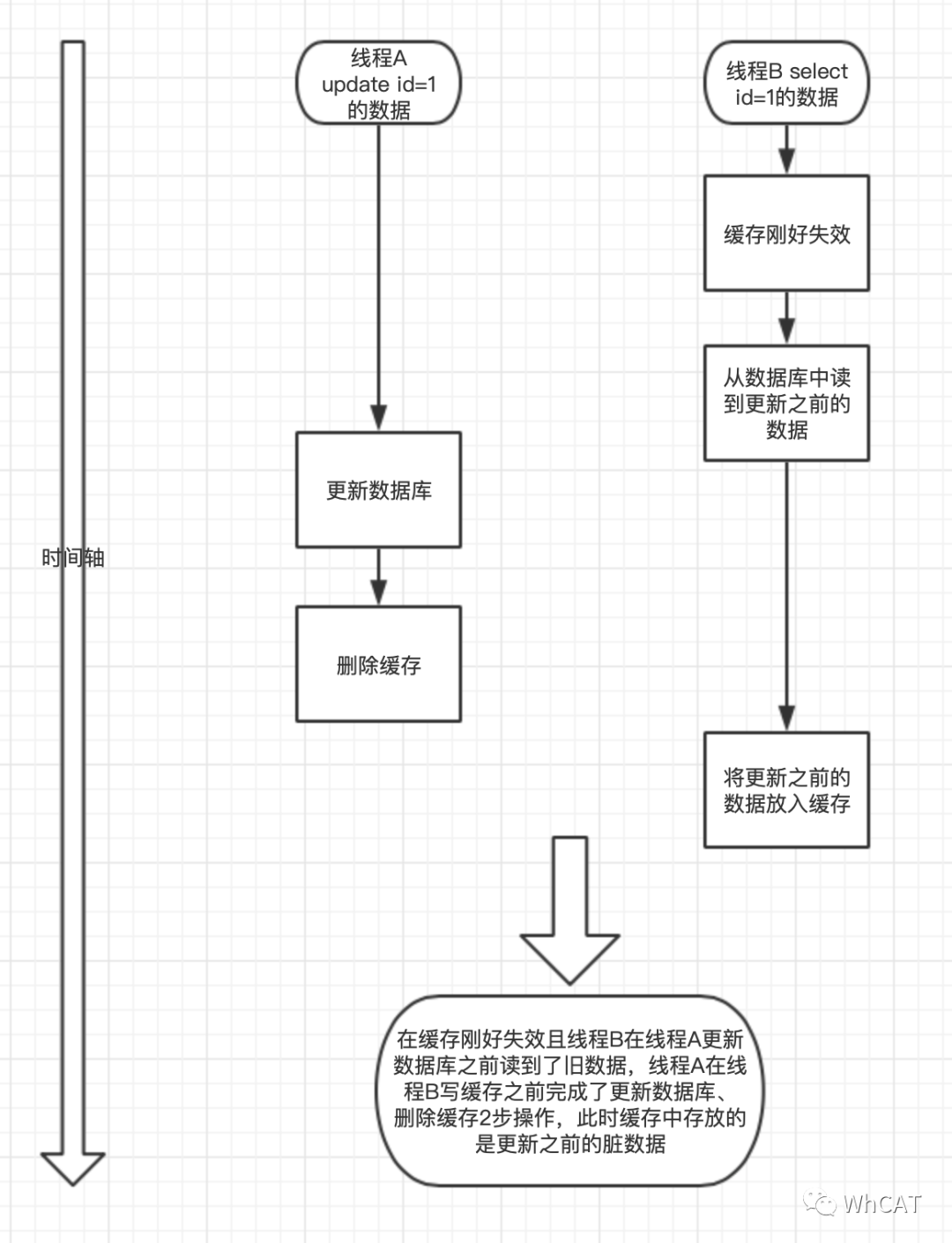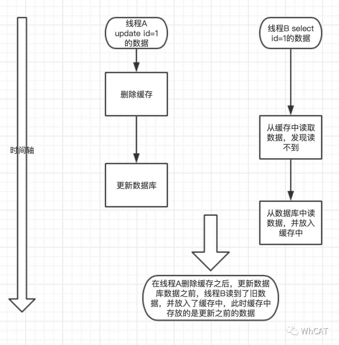 线程A要进行更新数据操作,先删除了缓存。同时,线程B要读取同一数据,发现缓存中已经没有数据了,于是线程B从数据库中读取,并将读取到的数据写入缓存中。此时线程A还未将新数据写入数据库,线程B读取到的数据是旧数据。于是就造成了写线程A删除了缓存中的旧数据,但却又被读线程B重新写入缓存的问题。因为本身写数据库操作就大大慢于读数据库操作,所以这个问题在高并发场景下是很容易出现的。