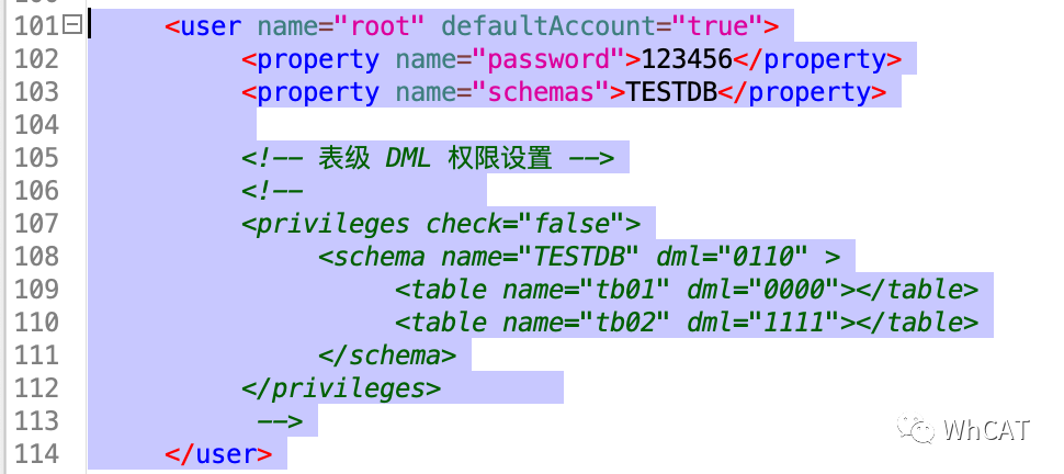 <user name="admin" defaultAccount="true"><property name="password">123456</property><property name="schemas">myDB</property></user>