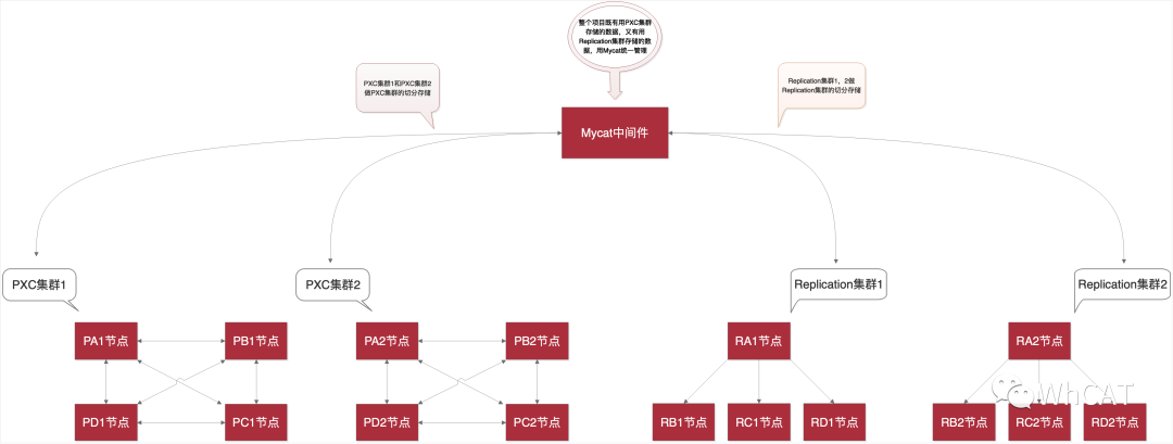 PXC集群和Replication集群之间不是冲突的关系,而是互补的关系,在项目中,可以共用这两个集群。至于怎么共用,答案是使用MyCat中间件。