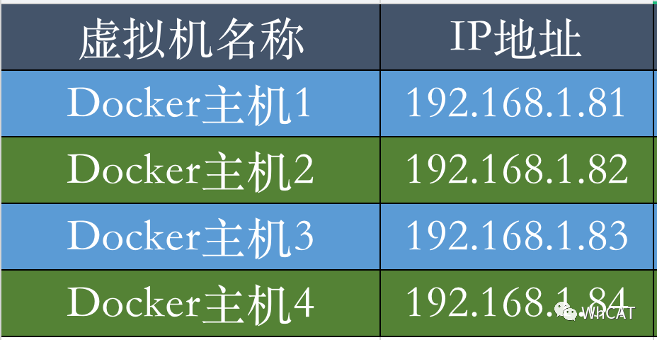 Docker主机3、4所执行的命令跟上面类似,只需要相应的修改一下名字即可。