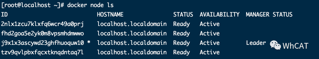 #创建Swarm集群(该节点自动变成管理节点)docker swarm init#查看Swarm集群中的Docker节点(管理节点上执行)docker node ls#删除Swarm集群的Docker节点(管理节点上执行)docker node rm 节点ID -f#退出Swarm集群(Workd节点上执行)docker swarm leave#退出Swarm集群(管理节点上执行)docker swarm leave -f