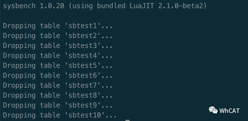 sysbench /usr/share/sysbench/tests/include/oltp_legacy/oltp.lua --mysql-host=192.168.1.10 --mysql-port=3306 --mysql-user=root --mysql-password=123 --oltp-tables-count=10 --oltp-table-size=100000 cleanup