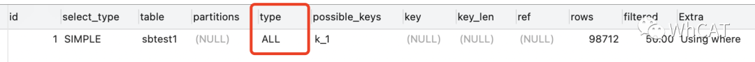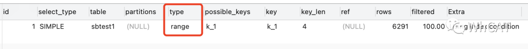 EXPLAIN SELECT id,k,cFROM sbtest1WHERE k < 50000;