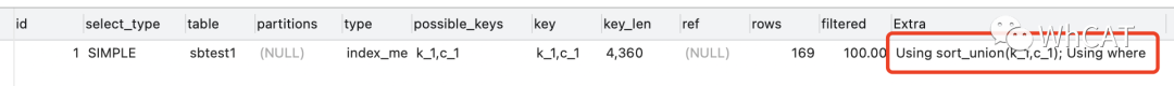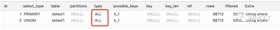 EXPLAIN SELECT id,k,c FROM sbtest1 WHERE k < 50000UNION ALLSELECT id,k,c FROM sbtest1 WHERE k > 50000;