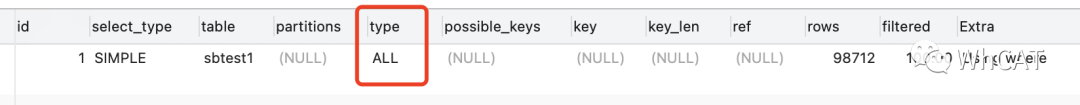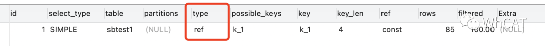 EXPLAIN SELECT id,k,cFROM sbtest1WHERE k = 100000 / 2;