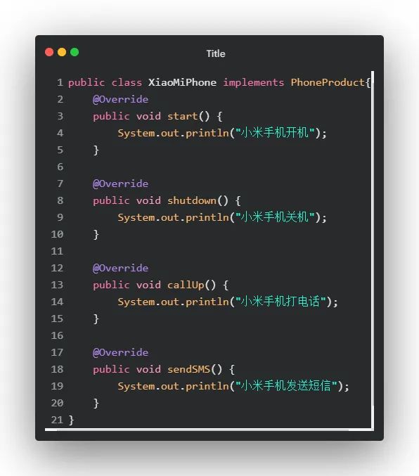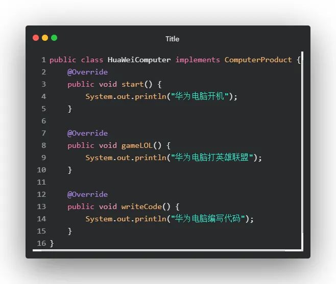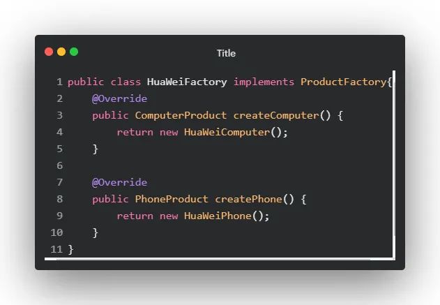 产品只是定义了抽象的行为,是需要具体的产品进行完善的,比如小米手机和小米电脑以及华为手机和华为电脑,从产品来说手机都属于抽象手机的具体产品,电脑都属于抽象电脑产品的具体产品。所以手机都应该实现PhoneProduct而电脑都应该实现ComputerProduct。