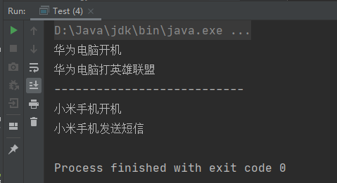 下面进行测试,我们生产一个华为电脑进行开机和打游戏,然后生产一个小米手机开机和打电话。可以看到实际上我们使用华为工厂进行了华为的电脑生产,用小米的工厂生产了小米手机。但是他们并不是同一个工厂,且从产品维度属于同一个产品,从同一个品牌维度又属于同一个品牌。