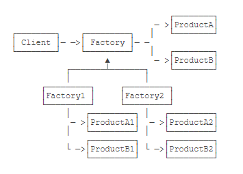 其中Factory扮演工厂的抽象角色,而Factory1和Fatcory2是具体的工厂角色负责生产。同时ProductA扮演产品的抽象角色,而ProductA1、ProductA2则扮演的是具体的产品角色,是被具体的工厂进行生产的。