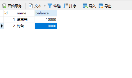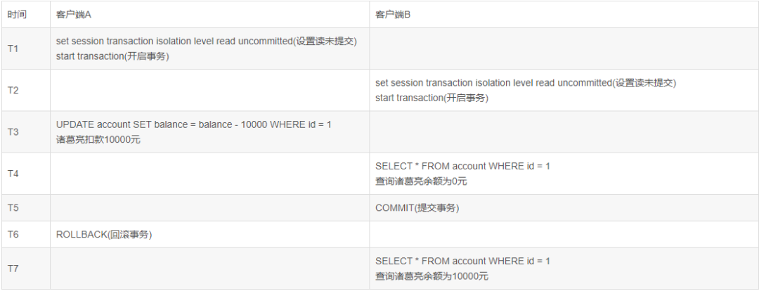 脏读存在于读未提交中,所以需要设置隔离级别为读未提交。如下所示,诸葛亮在事务A中扣款10000元,但是还没有提交,此时事务B就能够查询到扣款后的数据。但是如果此时A发生回滚会导致事务B的数据不是和之前查询的不一致,也就是脏读。