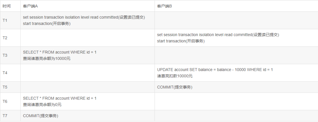 脏读存在于读未提交中和读已提交,所以需要设置隔离级别为读未提交或读已提交。如下所示,事务A查询余额为10000元,然后事务B在T4时刻将诸葛亮余额扣款10000元,并在T5时刻进行事务提交,此时事务A在T6时刻查询余额为0元,可以看到事务A在T3时刻和T6时刻查询同一数据却得到了不同结果,这种情况称之为不可重复读。