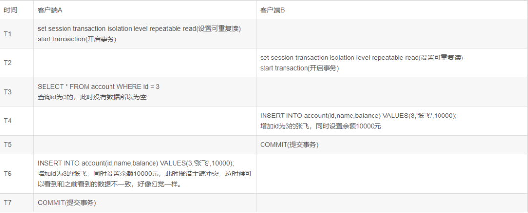 如果表中数据如如下所示,同时隔离级别为可重复读那么按照下面的时间进行执行,此时你觉得事务A和事务B查询的结果会是什么呢?