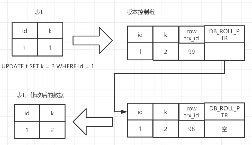 例如现在将表中id为1的数据的k修改为2,且当前事务ID为99,同时在版本控制链中,上一次这一行的数据是被事务id为98的进行插入的,那么这一行数据实际上的修改过程如下。