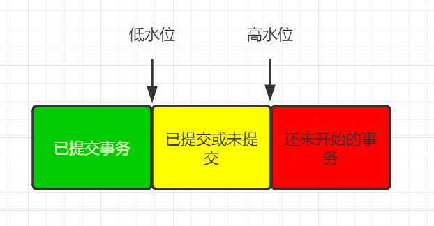 1.如果row trx_id小于等于低水位落在绿色部分,表示这个版本是已提交的事务或者是当前事务自己生成的,这个数据是可见的;