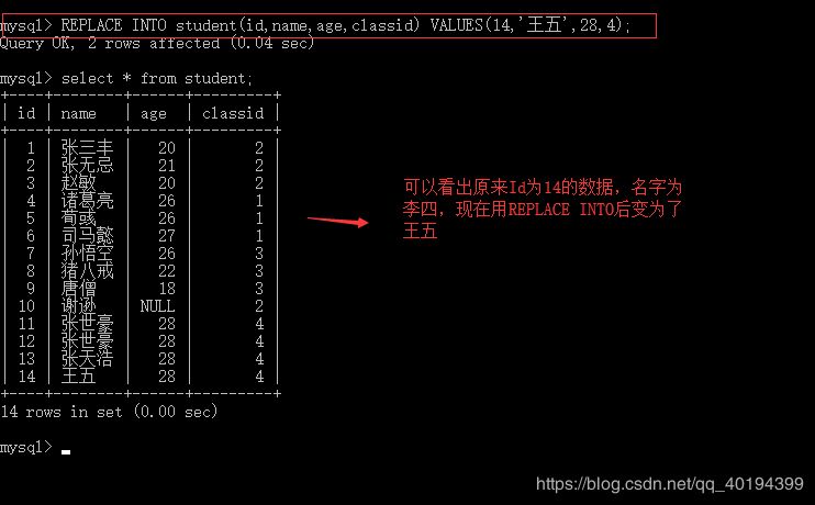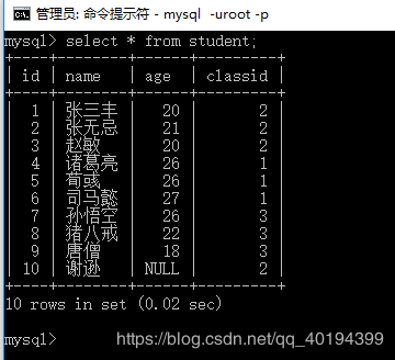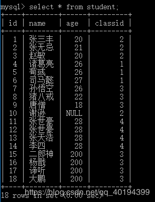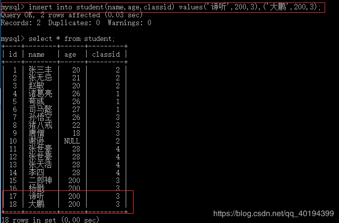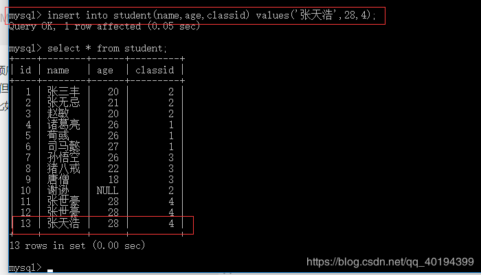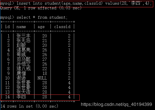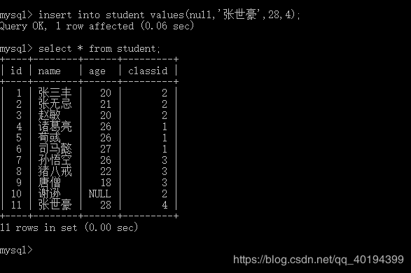 注意:insert这种简写的方式虽然非常简单,但是Values后面的值必须和表中的类顺序对应,且类型要保持一直,即使表中某一个列不需要值也必须赋值为null,比如我们的主键id设置的是递增实际上是不用设置值的,但是使用这种方式必须赋值为null
