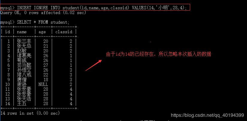 此语句的作用是如果插入的数据已经存在那么就忽略插入的数据(也就是不改变原来的数据),如果不存在则插入新的数据。注意:却分是否存在是通过主键来确定的