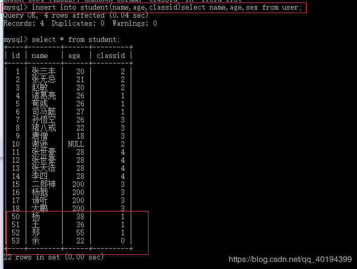 2.语法:insert into 插入的表名(字段1,字段2,字段3) select 被查询的字段1,被查询的字段2 from 被查询的表名。