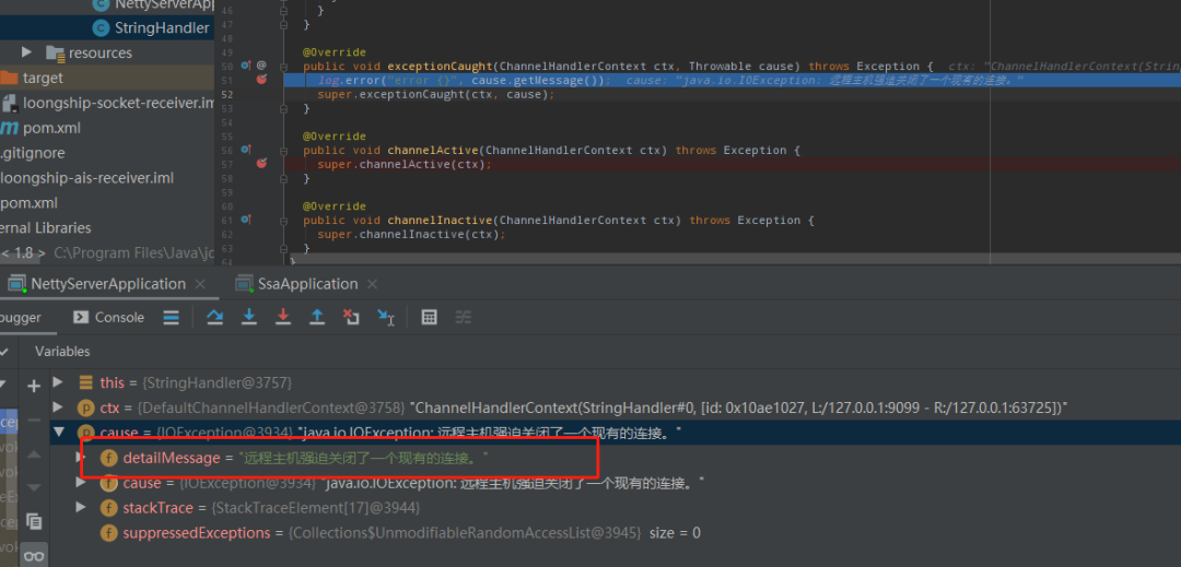 当客户端或者服务端接收数据处理出现异常或者客户端主动关闭连接:会进入如下方法
