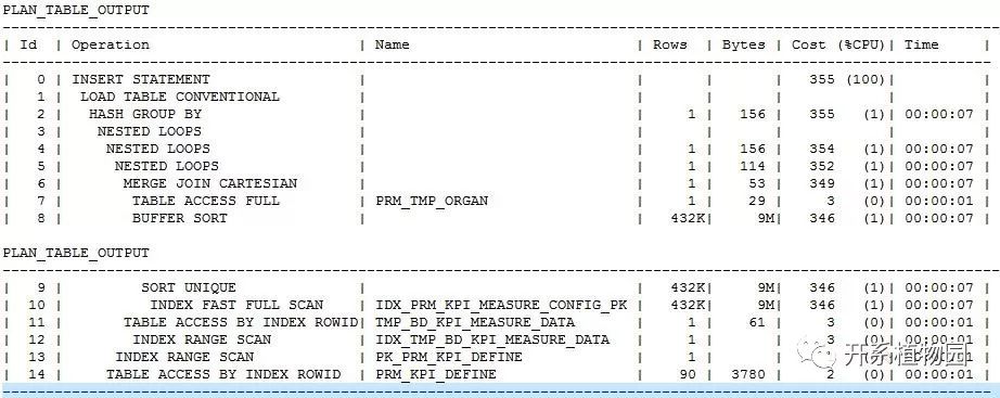 完成后使用explain plan for方式查看语句执行计划恢复正常,通知应用进行验证。该语句之前10小时未完成,在我们固定完临时表统计信息后4分钟不到就跑出了结果。