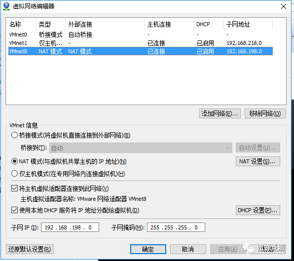 默认的虚拟机网络是NAT模式,网段192.168.198.0/24