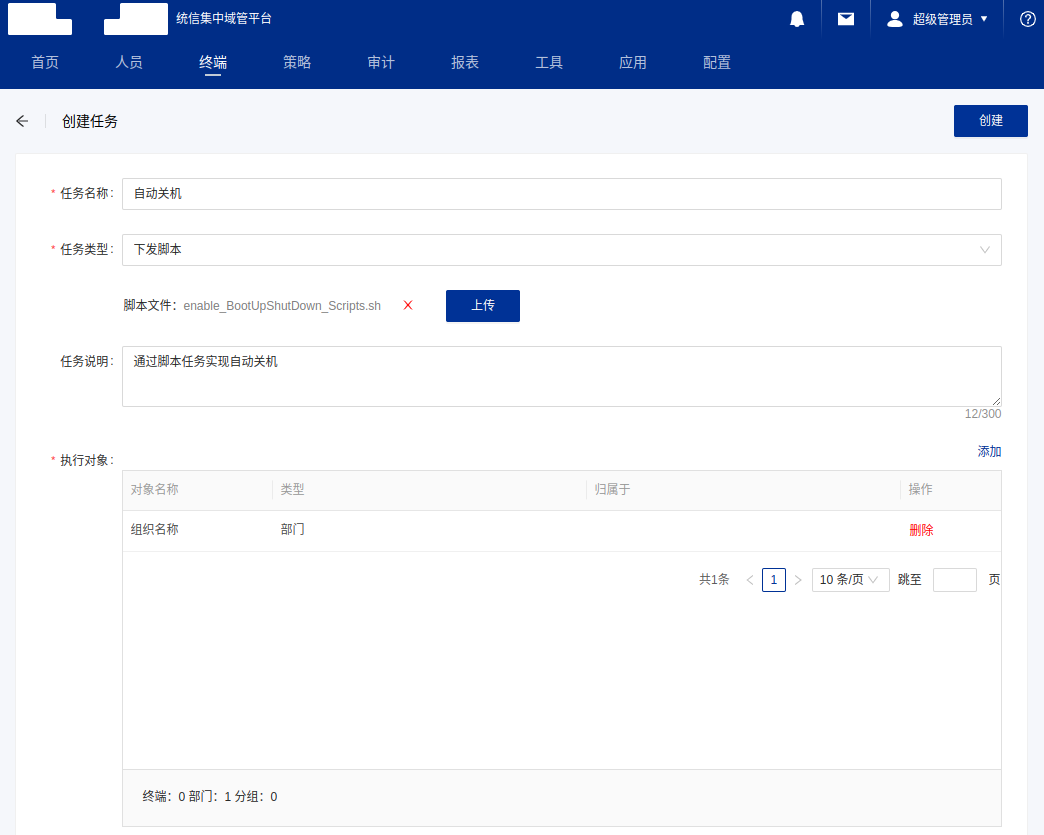 功能介绍:域管平台任务脚本即通过域管平台任务模块向终端下发脚本,可以配置下发终端范围,选择在终端立刻、定时或按周期执行该脚本,并可以通过任务回执信息查看脚本执行结果。