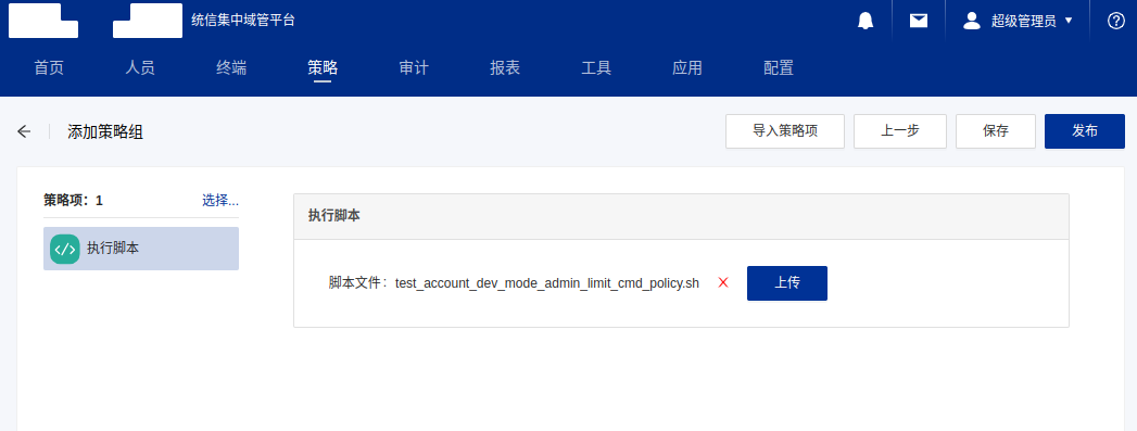 功能介绍:域管平台策略脚本即通过域管平台配置策略组,选择执行脚本策略项进行策略下发,由终端拉取策略而执行已配置的脚本文件。支持配置策略生效范围、例外目标、策略生效及失效时间等。如选择策略执行范围包括部门或分组,策略下发之后加入的终端或用户,也会执行该策略。