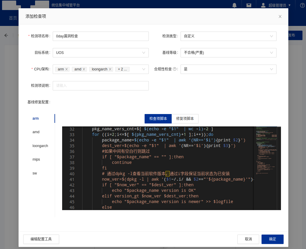 功能介绍:域管平台基线检查脚本即利用基线检查策略的自定义检查项功能,配置检查项脚本和修复项脚本,实现对终端合规性、安全性等相关配置的检查和修复。其中检查项脚本用于判断当前终端是否符合基线要求,修复项脚本用于不符合条件下执行修复动作。