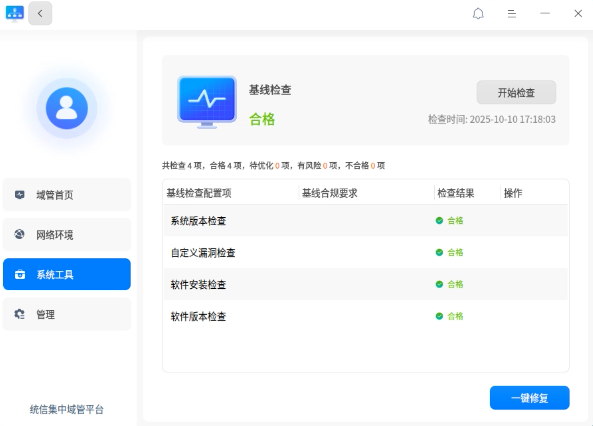 终端获取域管平台策略后,如发现有基线检查策略配置,则会在域管客户端中显示基线检查项及检查结果,对于不合规项可以根据配置进行自动或手动修复。