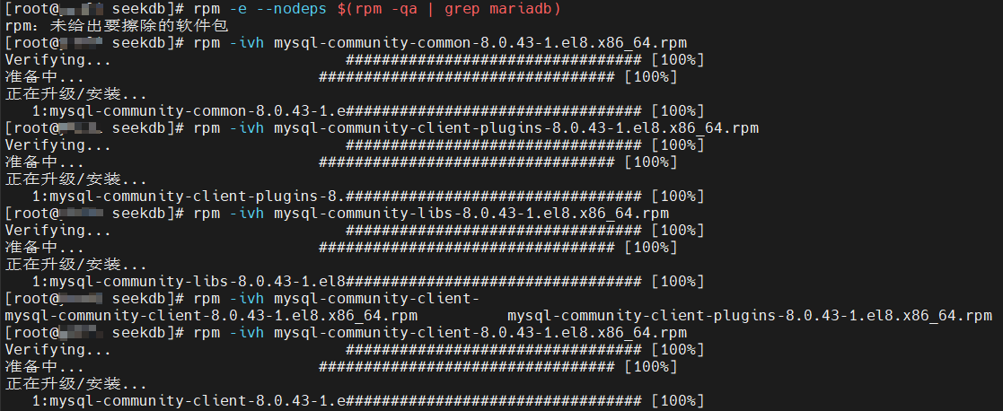 rpm -e --nodeps $(rpm -qa | grep mariadb) rpm -ivh mysql-community-common-8.0.43-1.el8.x86_64.rpm rpm -ivh mysql-community-client-plugins-8.0.43-1.el8.x86_64.rpm rpm -ivh mysql-community-libs-8.0.43-1.el8.x86_64.rpm rpm -ivh mysql-community-client-8.0.43-1.el8.x86_64.rpm