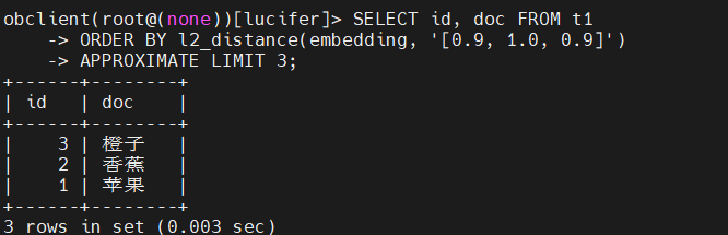 ORDER BY l2_distance(embedding, '[0.9, 1.0, 0.9]')