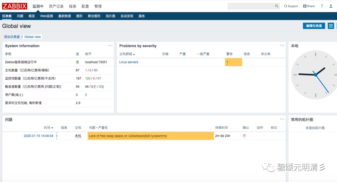 登录完成之后,我们就可以看到zabbix的仪表盘