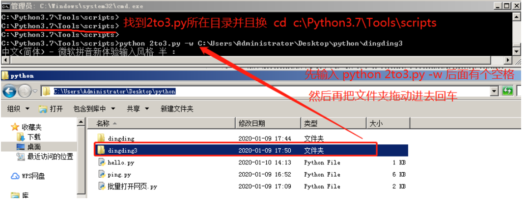 打开cmd切换到2to3.py所在目录:输入“python 2to3.py -w ”命令后不要急着回车,先把你要转换的python文件或目录文件夹直接拖到cmd窗口中,他会自动填充成“ python 2to3.py -w C:\Users\Administrator\Desktop\python\dingding3”然后回车即可。我的sdk是解压到桌面的“ C:\Users\Administrator\Desktop\python\dingding3 ”目录的,转换的同时会生成.bak备份文件