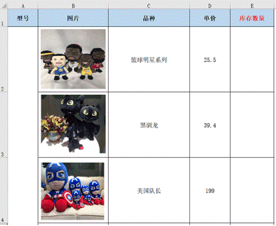 本例excel文件结构内容如下(python操作方法为将单元格区域复制为图片的方式,所以保存图片的质量取决于你excel中直观看到的图片大小,如果只想导出图片建议使用文章开篇推荐的方法!):