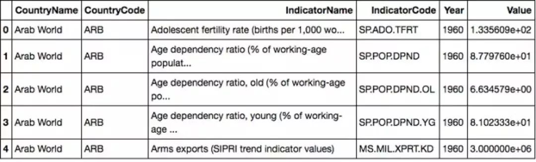 我们将使用世界发展指标数据集演示,这是一个Kaggle上的开放数据集。我们将使用数据集中的'indicators.csv'文件。