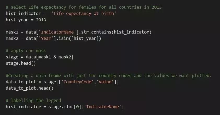 另外,我们仅保留国家代码和要绘制的值来作为我们的绘图数据。我们还需要提取指标的名称,以用作图中的图例。